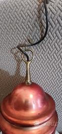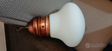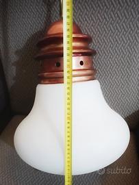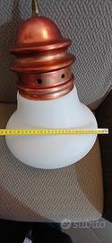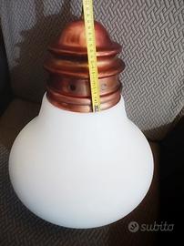 Vendesi iconico lampadario a sospensione modello "Arianna", disegnato da Piero Brombin per Artemide a metà degli anni '60 (circa 1965). Un pezzo autentico della storia del design italiano "Mid-Century". La lampada si distingue per la sua forma che richiama una lampadina stilizzata, composta da una calotta superiore in rame con lavorazione a gradini e un grande diffusore in vetro opale bianco (vetro lattimo) che garantisce una luce calda e diffusa. Dettagli e Dimensioni: Designer: Piero Brombin Produttore: Artemide Materiali: Rame e Vetro Opale Diametro vetro: circa 28 cm Altezza corpo lampada: circa 38 cm Stato di conservazione: Ottime condizioni vintage. La parte in rame presenta la sua patina originale che ne attesta l'autenticità e il fascino d'epoca.