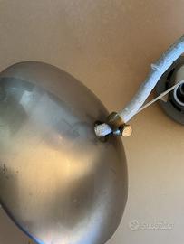 Lampadario Artemide des. Rodolfo Dordoni serie Musa Mod. Polinnia 1994 fuori produzione, la parte interna del rosone la plastica si è cotta e diventata delicata la parte della corona con parti rotte che vedete in foto, la parte dorata esterna è ok, per ovviare il problema visto che per montarla andava attaccata con fischer prima la parte in metallo sul muro e poi andava messo il cavetto in metallo e bloccato, poi si faceva il collegamento elettrico e poi si schiacciava il rosone negli inserti di plastica per bloccare il tutto, ma purtroppo con il tempo e il calore si sono cotti e rotti ( durante la progettazione dovevano fare qualche millimetro in più di spessore la plastica così avrebbe resistito di più) i tre inserti intorno la corona, ma non è un problema si attacca lo stesso la piastra al muro, poi appendete il lampadario a la misura che volete collegate i fili elettrici e coprite con il rosone e con il blocca filo in ottone fatto da me bloccate la vite sul filo senza stringere forte, giusto per tener fermo il rosone…misura altezza 45 cm. Diametro Max 53 cm. Altezza filo elettrico suo originale 57 cm. Ma potete accorciarlo a piacimento…solo consegna a mano a Parabiago