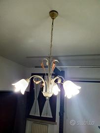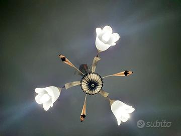 Aggiungi un tocco di classe e calore alla tua casa! Vendo splendido lampadario in ferro decorato a mano, caratterizzato da un design floreale raffinato ed elegante. La struttura color avorio è impreziosita da dettagli curati e da tre paralumi in vetro satinato a forma di bocciolo, che diffondono una luce morbida e accogliente.
