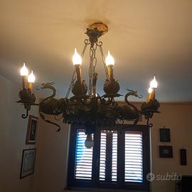 manufatto artigianale anni 40 in ferro battuto a 9 luci con 4 draghi perfettamente funzionante ed in perfetto stato di conservazione. contattare al 3495975507 se interessati e per ulteriori informazioni.
