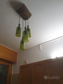 lampadario artigianale a forma di botte di legno, 4 lampadine led incluse effetto vintage con filamenti a vista in bottiglie di vetro verde intagliate