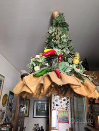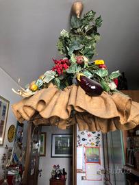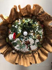 Lampadario rustico per cucina, fatto a mano artigianalmente , decorato con foglie d’edera e ortaggi, con volant di iuta tutto intorno.