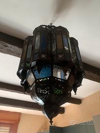 Vendo affascinante lampadario in stile marocchino, artigianale, realizzato in bronzo trafilato con vetri colorati, come visibile in foto.