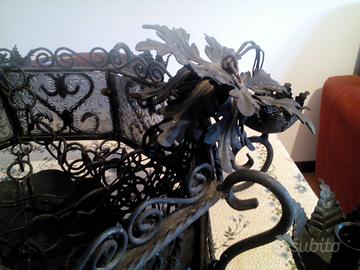 Lampadario in ferro battuto, produzione artigianale (anni 90 circa). Forma ottagonale impreziosita da pannelli in vetro satinato, con otto punti luce a forma di foglia. Il lampadario è in buone condizioni strutturali ma necessita di restauro estetico (piccola pulizia/riverniciatura) e, soprattutto, di un nuovo impianto elettrico a norma per essere utilizzato in sicurezza. L'impianto attuale è vecchio e non a norma.