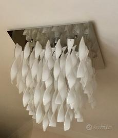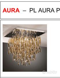 Lampada da soffitto. I vetri della collezione sono realizzati e rifiniti uno ad uno completamente a mano, con l'utilizzo delle tradizionali tecniche dei maestri di Murano. Ogni vetro ritorto costituisce un pezzo unico, vetri miscelati allo stato fuso attraverso tre successive levate, allungati e ritorti da un mastro vetraio e, ancora roventi, lasciati raffreddare molto lentamente. L' Aura in vendita è di colore bianco. Attacco : E27 4xmax 100W oppure LED.