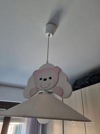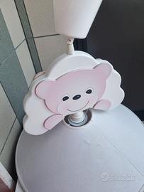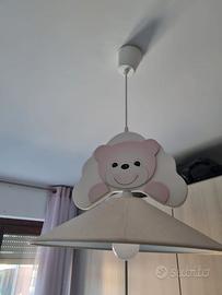 Vendo simpatico lampadario con sagoma di orsetto. In ottime condizioni Elegante sospensione in frassino rosa e bianco per cameretta bimba, laccato con vernici atossiche, rispettando le norme europee UNI EN 71 - 3. Dimensione 32 x 22 cm. Decorazione aerografata, motivo orsetto come foto. Eventualmente, lasciato basso, riempie immediatamente la cameretta creando un ambiente pieno, caldo e dolcissimo. Prezzo di listino ? 140, velocemente verificabile on.line