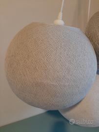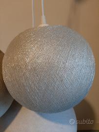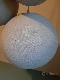 lampadario a sospensione a tre sfere in tessuto per camera di ragazzi, colori delle sfere grigio chiaro, grigio perla e argento, lampadine incluse. usato ma senza particolari segni di usura