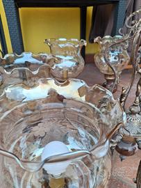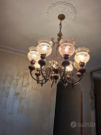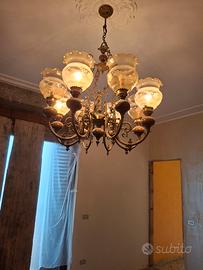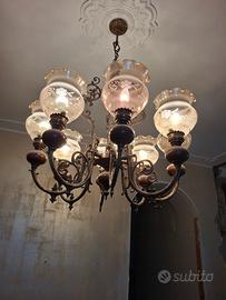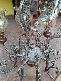 lampadario in bronzo e legno con angioletto,otto bocce aperte sopra