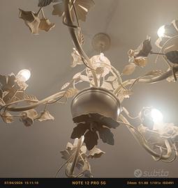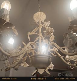 Lampadario in stile shabby chic realizzato in ferro battuto con decorazioni floreali bianche. Completamente pari al nuovo si vende x trasloco. larghezza tot 50 cm e altezza 40 cm