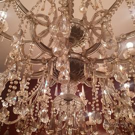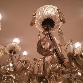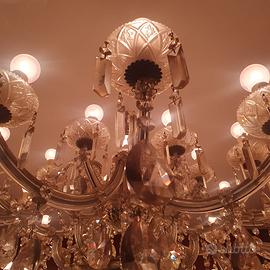 Lampadario di forma circolare a 10 braccia che si sviluppano a sua volta a doppio e triplo ramo reggente coppette e pendenti in cristallo tagliati a punta di diamante. Nessuna mancanza . Ottimo stato di conservazione . Perfettamente funzionante. Boemia prima parte XX secolo