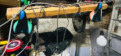 Vendo bellissimo lampadario con 4 lampade in legno e fissaggio ql tetto con cavi ! Funzionante e molto bello da vedere appeso artigianalmente completo di lampadine e fissaggio