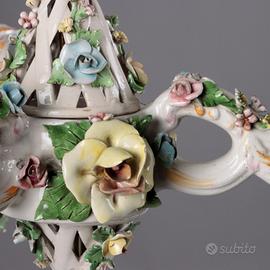 Lampadario Capodimonte a tre luci, in porcellana smaltata, lavorata a motivi