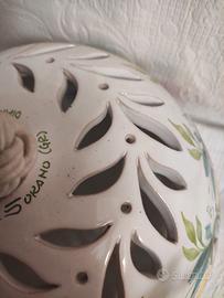 Luminoso e colorato lampadario in ceramica dipinto a mano ,fabbricato dalla ditta Pandarin e C. ,Sorano (GR),in perfetto stato con un'unico punto luce. Smontato x vendita abitazione. Le misure sono larghe.32 alt.20 cm
