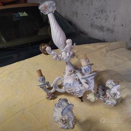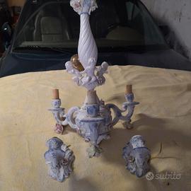 Lampadario ceramica a tre braccia con due applique a muro.