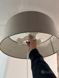Il paralume in tessuto agisce come un filtro, ammorbidendo l'emissione luminosa delle tre lampade. Il risultato è una luce ambientale calda e diffusa, che elimina i contrasti netti e crea un'atmosfera rilassante e accogliente