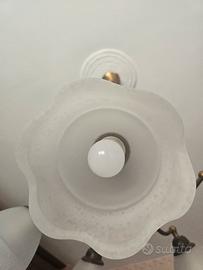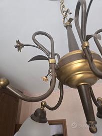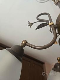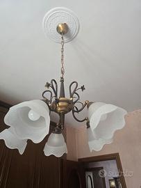 Elegante lampadario a 5 luci in stile classico, con struttura in metallo lavorato e paralumi in vetro decorato. 5 punti luce Struttura solida in metallo (color bronzo/oro) Paralumi in vetro satinato decorato Ideale per salotto, sala da pranzo o camera Ottime condizioni, funzionante