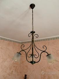 Vendo elegante lampadario in stile classico, realizzato in ferro battuto con finitura bronzo e vetri satinati a forma di fiore. Il design raffinato e le linee curve lo rendono perfetto per ambienti rustici, classici o shabby chic.