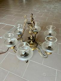 Questo lampadario in ottone, dallo stile classico e riccamente decorato, presenta sei braccia con eleganti volute e paralumi in vetro satinato finemente inciso. Il corpo centrale, lavorato con dettagli a rilievo, culmina in una sommità ornamentale. La catena in ottone e il rosone di fissaggio completano il design raffinato, perfetto per ambienti eleganti e tradizionali.