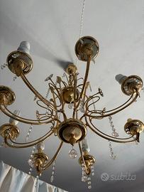 Vendo elegante lampadario in stile classico, realizzato in ottone dorato con pendenti e gocce in cristallo.