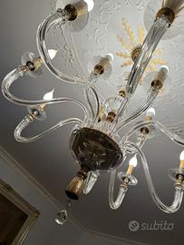 Vendo elegante lampadario classico a 10 luci in vetro trasparente con finiture dorate, ideale per ambienti raffinati come saloni, sale da pranzo o ingressi importanti. Il lampadario è in perfette condizioni, funzionante e completo in ogni sua parte. Design curato nei minimi dettagli, con bracci in vetro curvato e pendenti decorativi che riflettono splendidamente la luce.