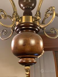 Lampadario classico antico da soffitto con catena metallo colore ottone brunito e legno anticato, diffusori in vetro sfumato ambra (Made in Italy)