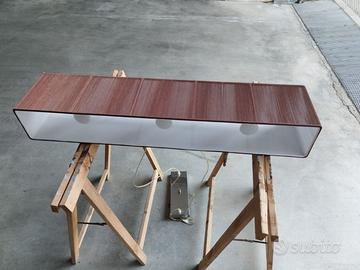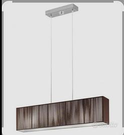 La lampada presenta una struttura in metallo, con finiture cromate e un paralume rettangolare lavorato a mano con pregiati fili di seta, disegnato da Manuel Vivian, oggetto pagato più di 900 euro...