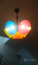 Lampadario da soffitto con 5 paralumi a cono in colori vivaci: giallo, blu, arancione, rosso e verde. Design giocoso e moderno, ideale per camerette, spazi creativi o ambienti contemporanei. Struttura centrale con fili intrecciati multicolore. In ottime condizioni, perfettamente funzionante. Facile da installare. Vendo causa cambio arredamento.