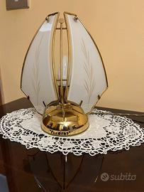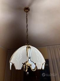 Lamapadario a sospensione in ottone e vetro con paralumi smerigliati e decorazioni a foglia incise. In abbinamento 2 abat jour