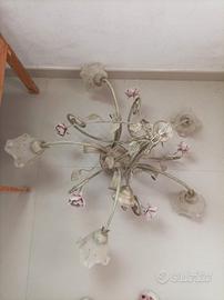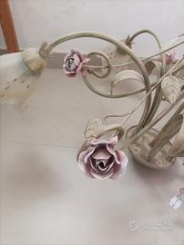 Bellissimo lampadario con un design floreale. - Struttura in metallo con dettagli di rose. - Finitura in colore bianco e rosa. - Cappelli in vetro.