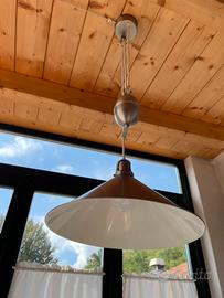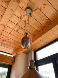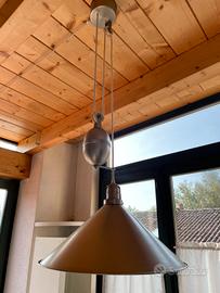 Lampadario con saliscendi Ikea, funzionante con contrappeso; in acciaio color grigio satinato. Diametro cm 42, altezza variabile. Consegna a mano.