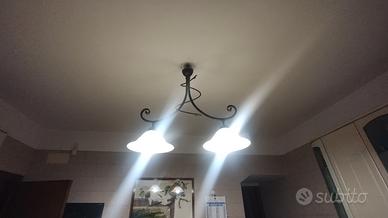 lampadario in ferro battuto brunito con due luci vetro opaco bianco diametro 30cm. ideale per cucine classiche o rustiche