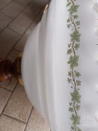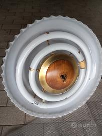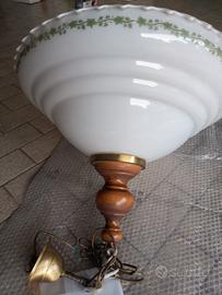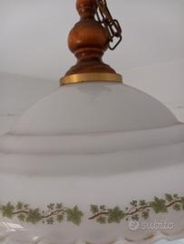 Lampadario in vetro decorato e legno, diametro 50 cm, con doppia illuminazione indipendenti.