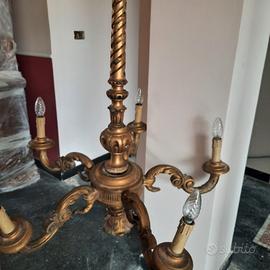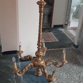 particolare lampadario d epoca di legno intarsiato dorato, con 5 luci a candela ed una centrale nella parte bassa... Adatto ad arredi a contrasto moderno/antico