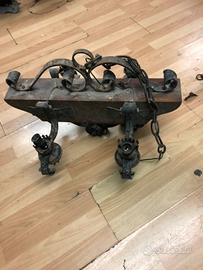 Bellissimo lampadario d'epoca in ferro battuto e legno, 4 luci. Per baite ristoranti o luoghi rustici. Molto bello con una piccola manutenzione diventa nuovo. Introvabile mei negozi di lampadari.