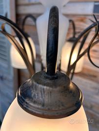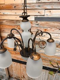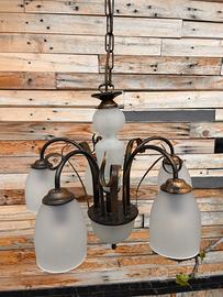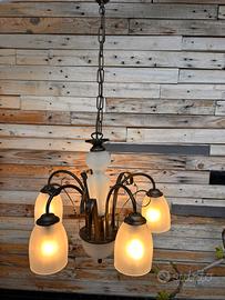 Lampadario salotto, 5 punti luce in ottone e vetro, perfettamente funzionante, integro in geni sua parte e perfetto. Effetto bronzo/oro della struttura Altezza dal soffitto 90 cm per un diametro massimo di 50cm