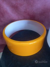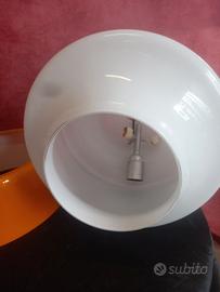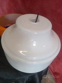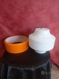 vendesi lampadario da soffitto vintage anni 70 Design di Alessandro Pianon per Vistosi. il lampadario realizzato da un struttura a due elementi, un corpo centrale in vetro bianco opalino e una fascia circolare arancione vivace. il lampadario in ottime condizioni. non spedisco consegna a mano. e oggetto molto delicato