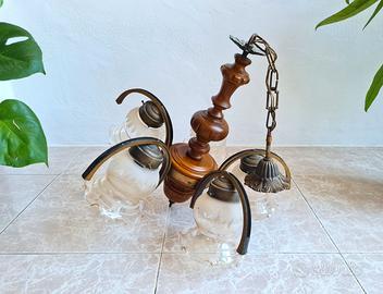 ✨ Vendo elegante lampadario a 5 luci, realizzato in legno tornito con dettagli in ottone brunito e coppe in vetro soffiato con bordo ondulato.