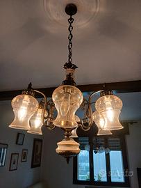 vendo lampadario da soffitto vintage con 6 punti luce in coppe di vetro, ceramica decorata a mano e montatura mista ottone trattabili