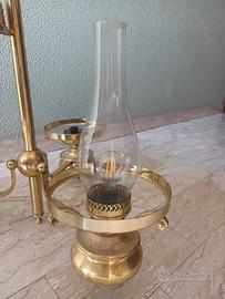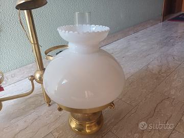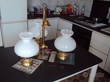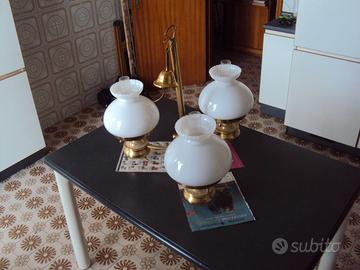 Lampadario vintage composto da tre punti luce con struttura in ottone e paralumi in vetro bianco opalino lavorato con bordo ondulato. Lampadine (non incluse) coperte da due vetri. Design classico, perfetto per ambienti in stile retrò, rustico o shabby chic.