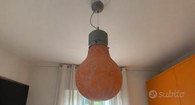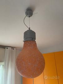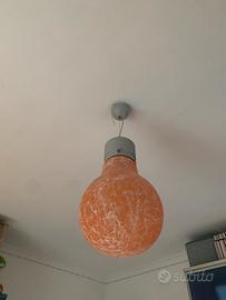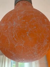 Lampadario a sospensione dal design moderno e originale, a forma di lampadina oversize. Diffusore in vetro arancione con elegante effetto marmorizzato bianco, in ottime condizioni