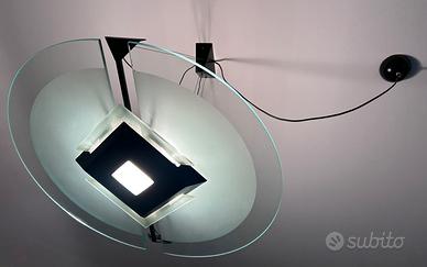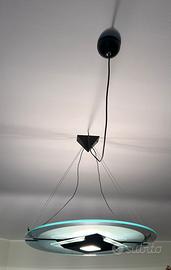 Il lampadario è composto da un grande disco in vetro acidato satinato che sembra fluttuare nell'aria, sostenuto da cavi d'acciaio regolabili. Al centro, la struttura quadrata in metallo nero ospita la fonte luminosa, garantendo una diffusione della luce morbida e d'atmosfera. Ritiro esclusivamenta a mano presso Cisano Bergamasco