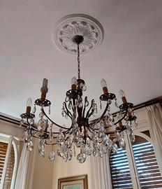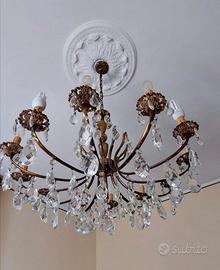 - Materiali principali: cristallo (pendenti), metallo dorato/ottone per struttura, rosone in gesso o stucco decorato
