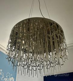 Vendo splendido lampadario contemporaneo con struttura in metallo lucido e pendagli in vetro/acrilico trasparente, completo di 2 applique abbinate.