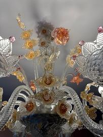 Lampadario di Murano inizio anni ’80 a 6 luci. E’ realizzato in stile Rezzonico (floreale) tipico della tradizione veneziana, richiamando i canoni estetici del XVIII secolo. Il vetro è soffiato a bocca con lavorazione "a costolature" sui bracci e applicazioni floreali in pasta di vetro colorata (rosa e ambra/oro). Smontaggio e trasporto a cura e a carico dell'acquirente.