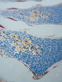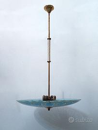 Lampadario a sospensione vintage attribuibile a Pietro Chiesa per Fontana Arte, straordinario esempio di design italiano di metà Novecento. Il protagonista è un ampio disco in vetro bombato, caratterizzato da una delicata tonalità azzurro polvere tendente al turchese. La superficie è impreziosita da una raffinata lavorazione a vetro battuto/inciso, che genera eleganti motivi a ventaglio, esaltando la maestria artigianale tipica delle produzioni di alto livello dell’epoca. Al centro di ciascuna sezione si sviluppano armoniosi decori floreali, con petali gialli e dettagli dorati, che conferiscono all’insieme un chiaro richiamo all’estetica Art Déco. La struttura è completata da un’asta centrale e da elementi di fissaggio in ottone, oggi impreziositi da una naturale patina del tempo che ne testimonia autenticità e fascino. Di particolare pregio il tubo in vetro a torciglione che riveste parte dell’asta, dettaglio distintivo delle migliori lavorazioni muranesi e milanesi. Il lampadario si presenta in ottime condizioni generali, con lievi segni del tempo coerenti con l’età, che non ne compromettono né l’estetica né la funzionalità. Dimensioni: Altezza: 84 cm Diametro: 45 cm