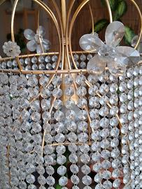 Lampadario vintage a sospensione in metallo dorato e cristalli con una luce centrale, un cristallino da sistemare
