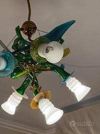 Lampadario in cristallo ceco-olandese di Boemia del designer, architetto e artista Borek Sipek (1949-2016). La lampada è pubblicata da Driade. La lampada è un modello a sospensione Luigi I° 1989 ca struttura in ottone, bracci a movimento curvo in cristallo verde, 5 diffusori conici in vetro opalino con anelli di diversi colori, monta lampadine con attacco E14 con possibilità di inserire adattatori per lampadine E12 USA.