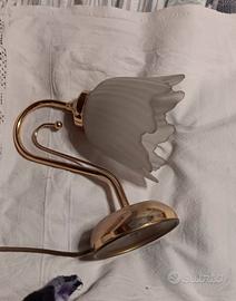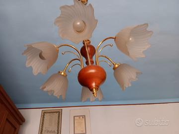 Lampadario in perfette condizioni con abat-jour abbinate. Legno scuro e montatura dorata. Visibile a Collegno (TO). Prezzo richiesto 80€.