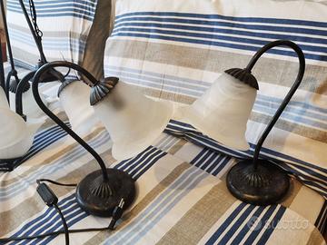 set lampadario e 2 abatjour camera in ferro anticato, artigianale, costruito a disegno, coppe in vetro murano, causa cambio arredamento