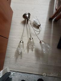 Lampadario in ottone colore acciaio satinato compreso di coppe in cristallo, due lampade comprese di coppe in cristallo e due applichi, tutto comprato in fabbrica di buona fattura. Possibilità di venderli separatamente.
